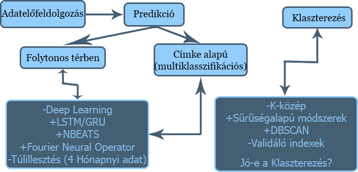 Gépi tanulás: A terület erősen interdiszciplináris terület ezért sokszor nehézkes megtalálni a megfelelő modellt az adott feladatra. Olyan kérdésekre keressük a válaszokat, mint például, hogy milyen adatelemek tartoznak egy csoportba (klaszterezés illetve osztályozás) vagy milyen szabályszerűségek nyerhetőek ki az adathalmazból (asszociációs szabályok). Gyakran szükséges ezek együttes, egymás utáni alkalmazása is, erre mutatunk példát a fejezethez tartozó ábrával.